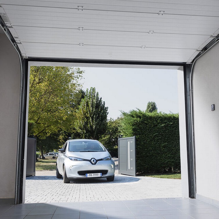 Een sectionaaldeur bestaat uit meerdere horizontale panelen die verticaal omhoog schuiven en netjes onder het plafond van de garage worden opgeborgen. De panelen zijn met scharnieren aan elkaar verbonden en lopen via stevige rails. Dit maakt de sectionaaldeur bijzonder ruimtebesparend en eenvoudig in gebruik, vooral in combinatie met Somfy-motorisatie voor extra comfort en gebruiksgemak.