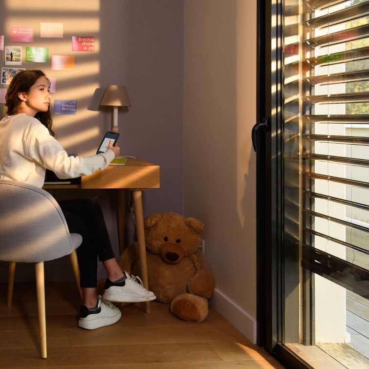In vergelijking met handmatige oplossingen kun je tussen de 4 en 7 °C* besparen tijdens de hittepieken met geautomatiseerde rolluiken, binnen- of buitenjaloezieën.